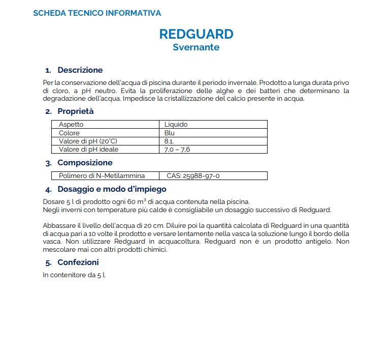 REDGUARD serve a proteggere l'acqua della piscina durante il periodo invernale, prevenendo la proliferazione di alghe e batteri e la formazione di sedimenti sulle pareti. È un prodotto antialghe e anticalcare da utilizzare per la chiusura invernale della piscina, prima di coprirla.